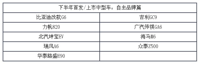 [汽车之家新闻] 在为大家带来了《下半年首发/上市中型车:合资/进口车篇》后,我们接下来为大家带来的是中型车系列的自主品牌篇。本期本章将涉及像比亚迪改款G6、吉利GC9、绅宝EV、力帆820等自主品牌中型车产品。相比合资以及进口品牌,自主品牌的中型车产品主攻的市场更多是8-18万元区间,如果您未来的预算在这个区间中,您可以关注下今天我们介绍的新产品,因为其中有不少就将在下半年正式上市。