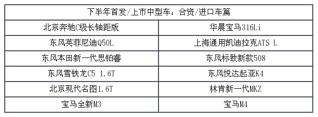 总结:在本期文章当中我们发现,在合资和进口中型车当中存在两个趋势,第一是豪华中型车加长趋势已经扩张到日系和美系品牌,未来Q50L和ATS L也将加入国产加长的道路。另一方面,搭载小排量涡轮增压发动机也成为了各大品牌中型车未来的发展方向。而未来,除了合资/进口品牌之外,自主品牌又将有哪些中型车产品与我们见面呢,请关注我们下期的文章《下半年首发/上市中型车:自主品牌篇》。(文/汽车之家 耿源)