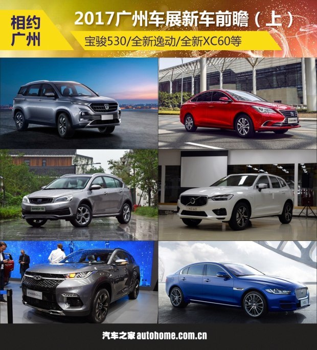 [汽车之家新闻] 各位网友大家好,在经过了上海车展和成都车展之后,2017年最后一个国内大型车展——广州车展距离我们越来越近了,其将会在11月17日正式开幕。在本届车展当中,又将涌现出众多的首发以及上市新车,而我们也将在本篇前瞻文章中,带您提前领略这些新车的风采,快速锁定本届车展当中的重磅新车。首期我们筛选了包括宝骏530、全新逸动、全新XC60、广汽传祺GM8、上汽斯柯达KAROQ、领克01、吉利S1、幻速S7、奇瑞EXEED TX、捷豹XEL、马自达CX-3、全新Cayenne以及观致Model Young在内的15款新车,下面就请一同走进本期文章中吧。