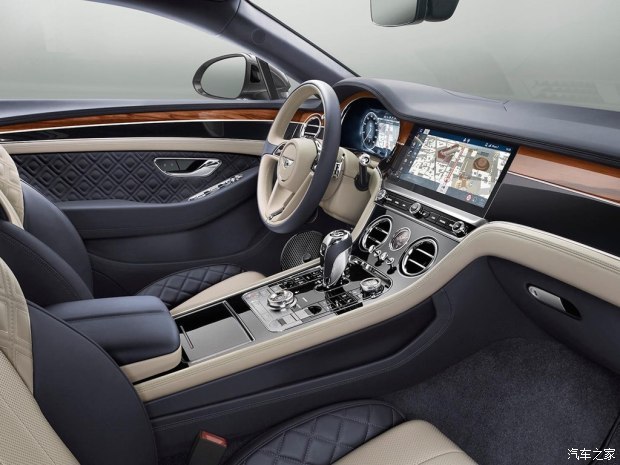 内饰部分,新车与现款车型相比有着很大的变化,新车的中控台部分摒弃了原本的仿金属皮革装饰板,选择在大面积皮革材质包裹的基础上融入了木纹饰板以及镀铬装饰条,每一台欧陆GT将应用超过10平方米的木料,从而增强了其高档豪华感。空调出风口位置和百年灵时钟被移到了液晶显示屏下方。同时,新车采用了全新挡杆样式,并对其周围的功能按键进行全新的布局,看起来更加简洁。